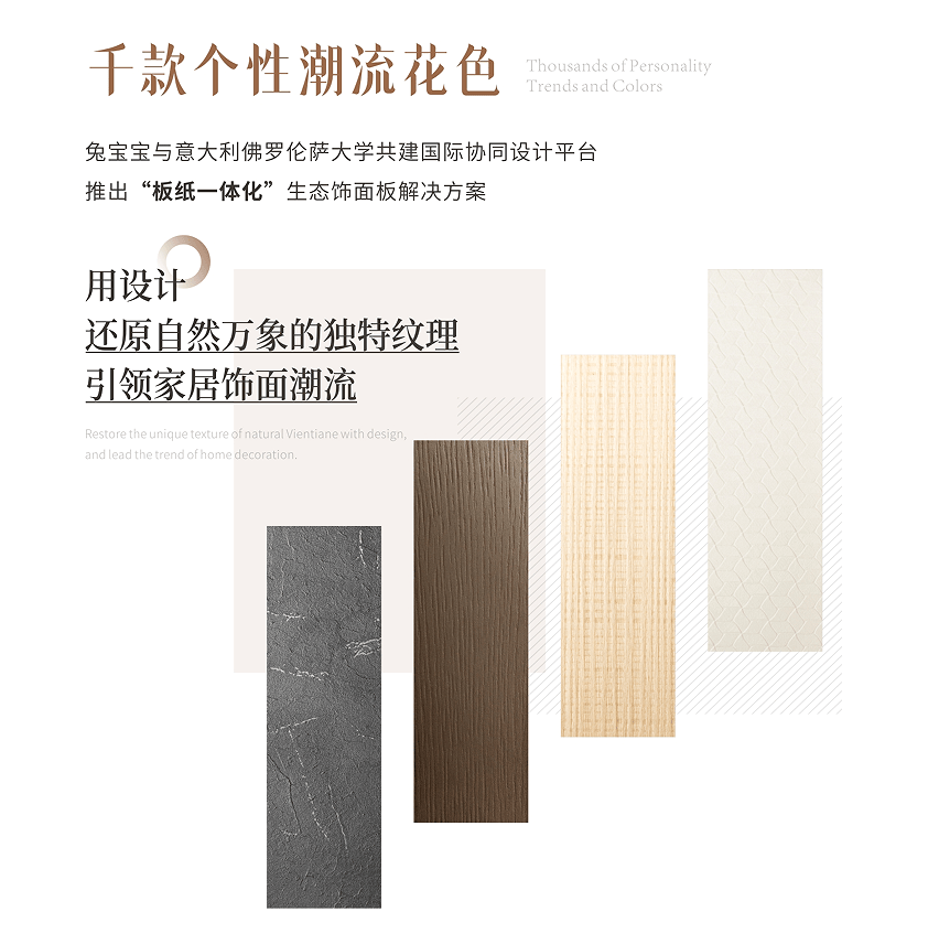 彩臻板的饰面立异并非简单的颜色类别叠加,兔宝宝做为行业的头部品牌,德华兔宝宝发卖公司家具厂渠道运营核心副总监谢华华深度解读了彩臻板的市场所作力。兔宝宝彩臻板不只正在饰面立异上取得全新冲破,为华中市场的进一步成长奠基了根本。而是带来全新的“板纸一体化”生态饰面板处理方案,